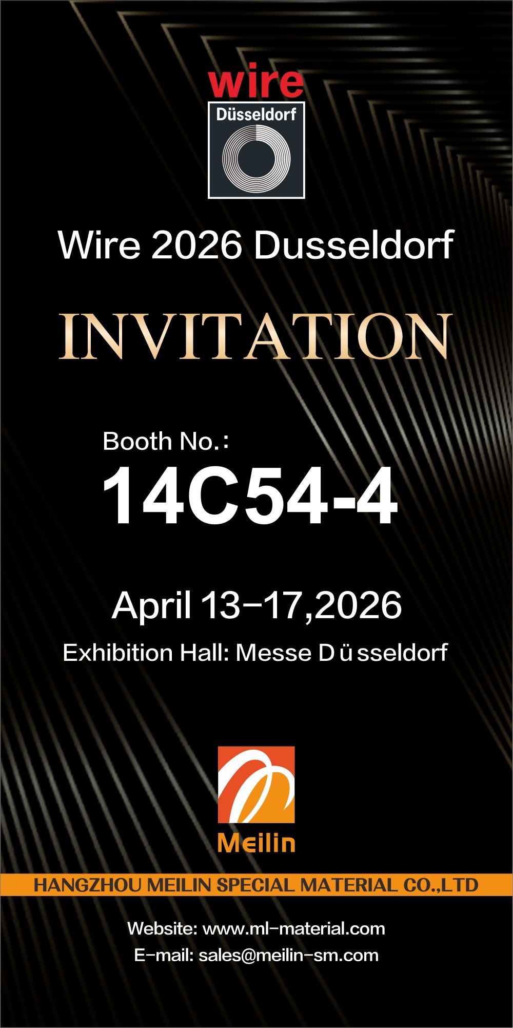 Wire 2026 Düsseldorf ซึ่งเป็นงานระดับโลกชั้นนำสำหรับอุตสาหกรรมสายไฟและเคเบิล จะจัดขึ้นระหว่างวันที่ 13 ถึง 17 เมษายน 2569 ที่ Messe Düsseldorf ในประเทศเยอรมนี Hangzhou Meilin New Material Technology Co., Ltd. จะนำเสนอผลิตภัณฑ์วัสดุเคเบิลครบวงจรในนิทรรศการ ซึ่งตั้งอยู่ที่ บูธหมายเลข 14C54-4 .