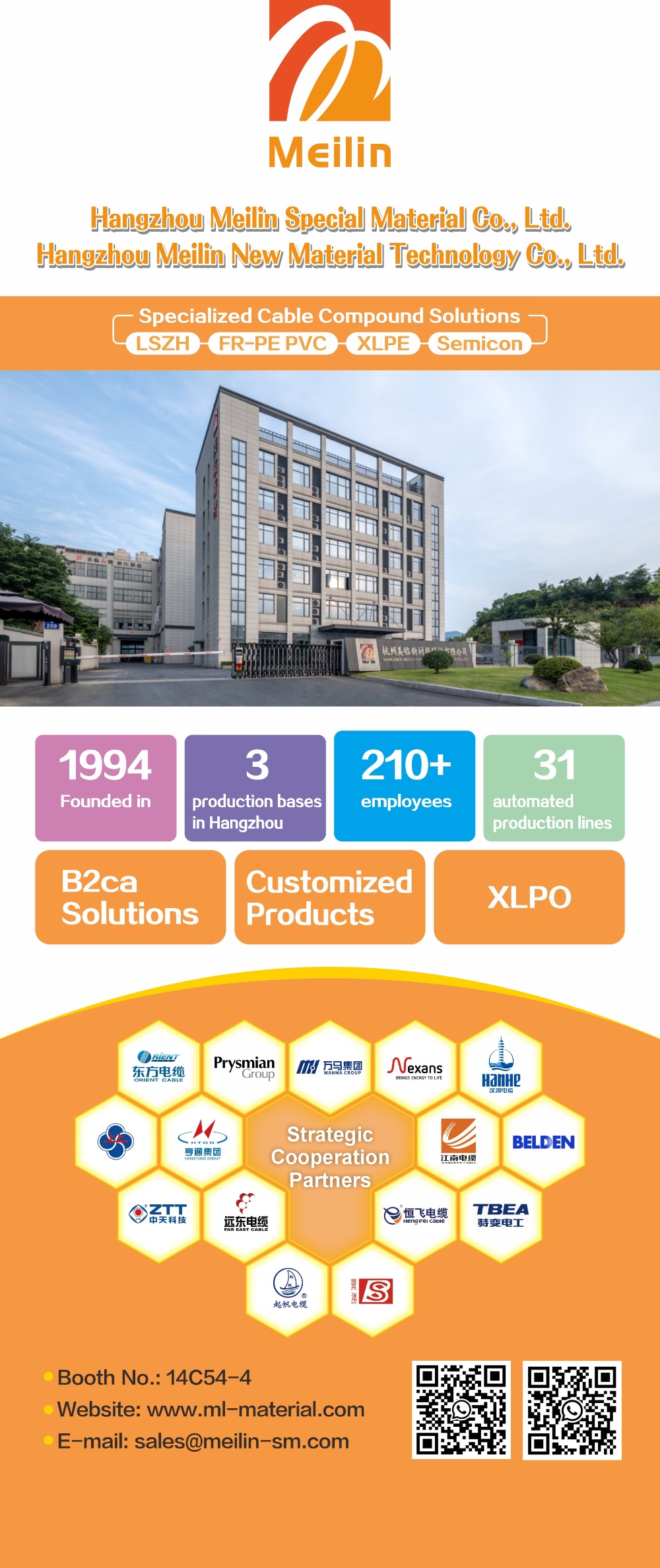 บริษัทก่อตั้งขึ้นในปี 1994 โดยมีประสบการณ์มากกว่า 30 ปีในภาคส่วนวัสดุเคเบิล ในปี 2024 Hangzhou Meilin Special Material Co., Ltd. ก่อตั้งขึ้นโดยเป็นส่วนหนึ่งของการขยายกลยุทธ์ของบริษัท ปัจจุบัน บริษัทมีฐานการผลิต 3 ฐาน พร้อมด้วยสายการผลิตอัตโนมัติขั้นสูง 31 สายการผลิต โดยมีพื้นที่ก่อสร้างรวมเกิน 45,000 ตารางเมตร กลุ่มผลิตภัณฑ์ของบริษัทประกอบด้วย LSZH, PVC, XLPE, SEMICON, SOLAR CABLE และซีรีส์อื่นๆ ที่ใช้กันอย่างแพร่หลายในด้านพลังงาน โทรคมนาคม พลังงานใหม่ และสาขาอื่นๆ ด้วยความสามารถในการผลิตที่แข็งแกร่งและคุณภาพผลิตภัณฑ์ที่สม่ำเสมอ บริษัทจึงบรรลุมูลค่าผลผลิตต่อปีมากกว่า 700 ล้านหยวนในปี 2567 ให้บริการลูกค้าทั้งในประเทศและต่างประเทศ
